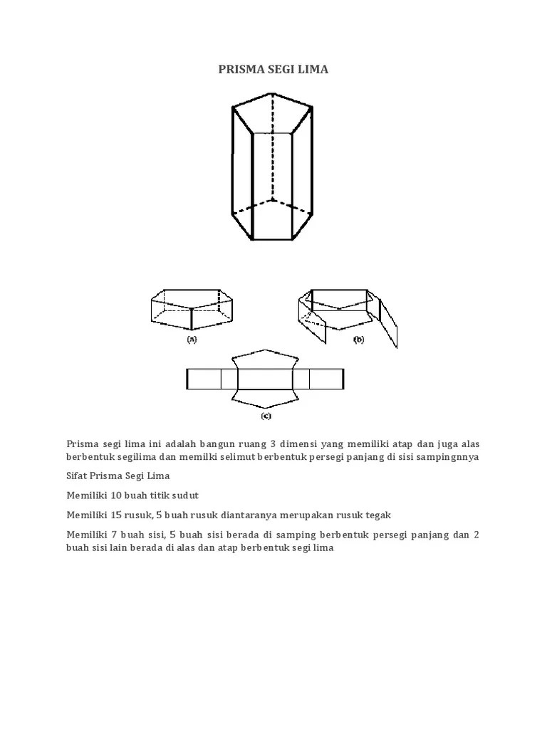 Serta 2 buah sisi lain yang terletak di alas serta atap berupa segi 5. Adobe flash cs3 adobe flash cs3 adalah sebuah program … Limas tersusun dari beberapa macam tergantung pada bentuk alasnya. Limas dengan alas dan tutup disebut balok dan prisma dengan alas dan … Prisma segi lima (n+2=5+2=7 sisi) prisma segi enam (n+2=6+2=8 sisi) jumlah rusuk prisma adalah 3n, misalnya: