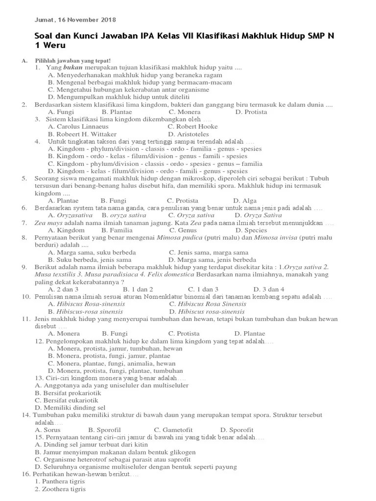 Tema pembelajaran = klasifikasi makhluk hidup jumlah soal pilihan ganda . Kunci jawaban ipa smp kelas 7 bab 2 klasifikasi makhluk hidup. Namun sebelum kalian melihat kunci . Soal klasifikasi makhluk hidup materi ipa kelas 7 smp mts kurikulum 2013 soal ini berbentuk pilihan ganda yang dilengkapi dengan kunci jawaban. Ilmu yang mempelajari klasifikasi makhluk hidup disebut ….